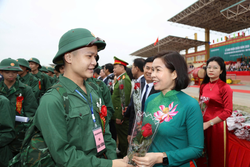 Các đồng chí lãnh đạo tỉnh và lãnh đạo xã tặng hoa, động viên các tân binh lên đường nhập ngũ