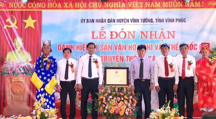 Đại diện Bộ Văn hóa, Thể thao và Du lịch, đồng chí Nông Quốc Thành (thứ 4 từ bên phải) - Phó Cục trưởng Cục Văn hóa cơ sở trao bằng công nhận Lễ hội truyền thống xã Đại Đồng, huyện Vĩnh Tường là Di sản văn hóa phi vật thể Quốc gia