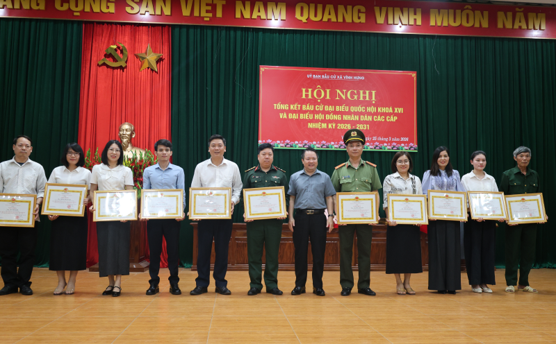 Ghi nhận những kết quả đạt được, Đảng bộ và Nhân dân xã Vĩnh Hưng vinh dự được Chủ tịch UBND tỉnh Phú Thọ tặng Giấy khen vì đã có thành tích xuất sắc trong cuộc bầu cử đại biểu Quốc hội khóa XVI và đại biểu HĐND các cấp nhiệm kỳ 2026–2031. Đồng thời, đồng chí Nguyễn Thị Châm – chuyên viên phòng Văn hóa - Xã hội cũng vinh dự được nhận Giấy khen của Chủ tịch UBND tỉnh.