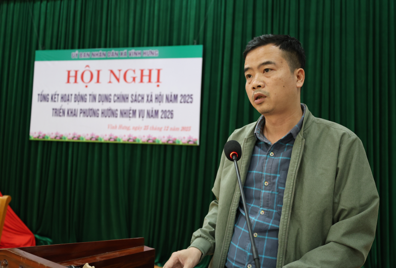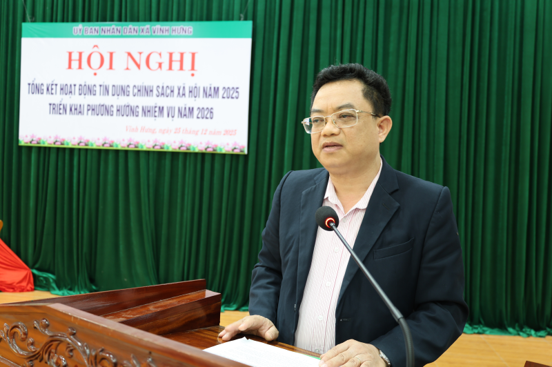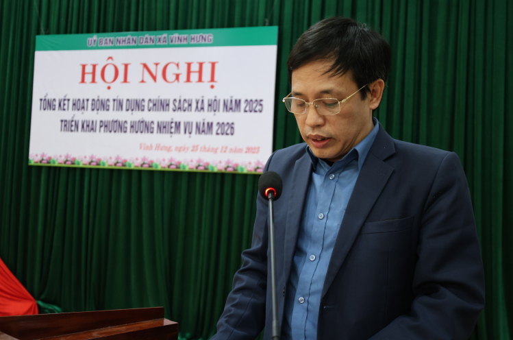 Phát biểu chỉ đạo tại hội nghị, Đồng chí Trương Đức Tuấn - Bí thư Đảng ủy, Chủ tịch HĐND xã nhấn mạnh: năm 2025 là năm có ý nghĩa đặc biệt quan trọng đối với xã Vĩnh Hưng khi xã được hình thành trên cơ sở sáp nhập ba đơn vị hành chính cũ Đại Đồng, Nghĩa Hưng, Yên Lập và là năm đầu tiên thực hiện Nghị quyết Đại hội Đảng bộ xã lần thứ I, nhiệm kỳ 2025–2030. Trong bối cảnh còn nhiều khó khăn, song với sự lãnh đạo toàn diện của Đảng ủy, sự điều hành của UBND xã và sự phối hợp chặt chẽ của NHCSXH Vĩnh Tường cùng các tổ chức chính trị – xã hội, hoạt động tín dụng chính sách xã hội trên địa bàn đã đạt nhiều kết quả tích cực, góp phần giữ vững ổn định chính trị – xã hội, nâng cao đời sống nhân dân. Đồng chí Bí thư Đảng ủy xã đề nghị trong năm 2026, các cấp, các ngành, các tổ chức chính trị – xã hội tiếp tục tăng cường lãnh đạo, chỉ đạo, triển khai hiệu quả các chủ trương, chính sách của Đảng và Nhà nước về tín dụng chính sách xã hội; đẩy mạnh công tác tuyên truyền, nâng cao nhận thức của người dân, gắn việc vay vốn với chuyển giao khoa học kỹ thuật, nhân rộng các mô hình sản xuất kinh doanh hiệu quả; tăng cường công tác kiểm tra, giám sát, xử lý nợ quá hạn, nâng cao chất lượng tín dụng, đáp ứng ngày càng tốt hơn nhu cầu vốn của nhân dân.