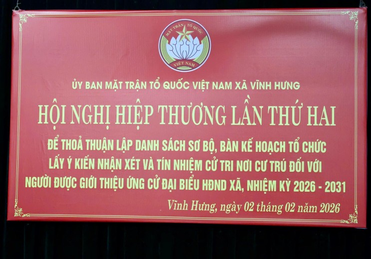 Sáng ngày 02/02/2026, Ban Thường trực Ủy ban Mặt trận Tổ quốc Việt Nam xã Vĩnh Hưng tổ chức hội nghị hiệp thương lần thứ hai nhằm thỏa thuận lập danh sách sơ bộ người ứng cử đại biểu Hội đồng nhân dân xã nhiệm kỳ 2026 – 2031 và bàn kế hoạch tổ chức lấy ý kiến nhận xét, tín nhiệm của cử tri nơi cư trú đối với người được giới thiệu ứng cử.